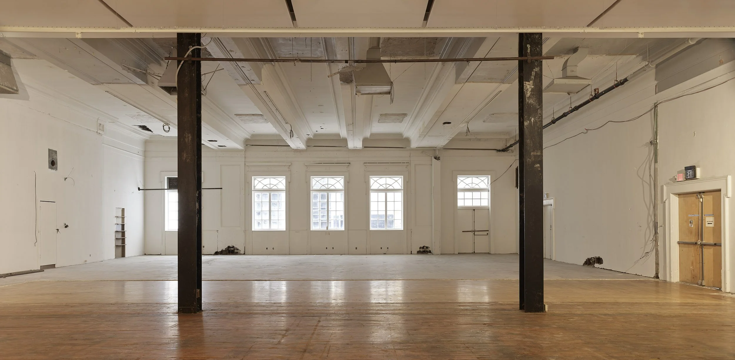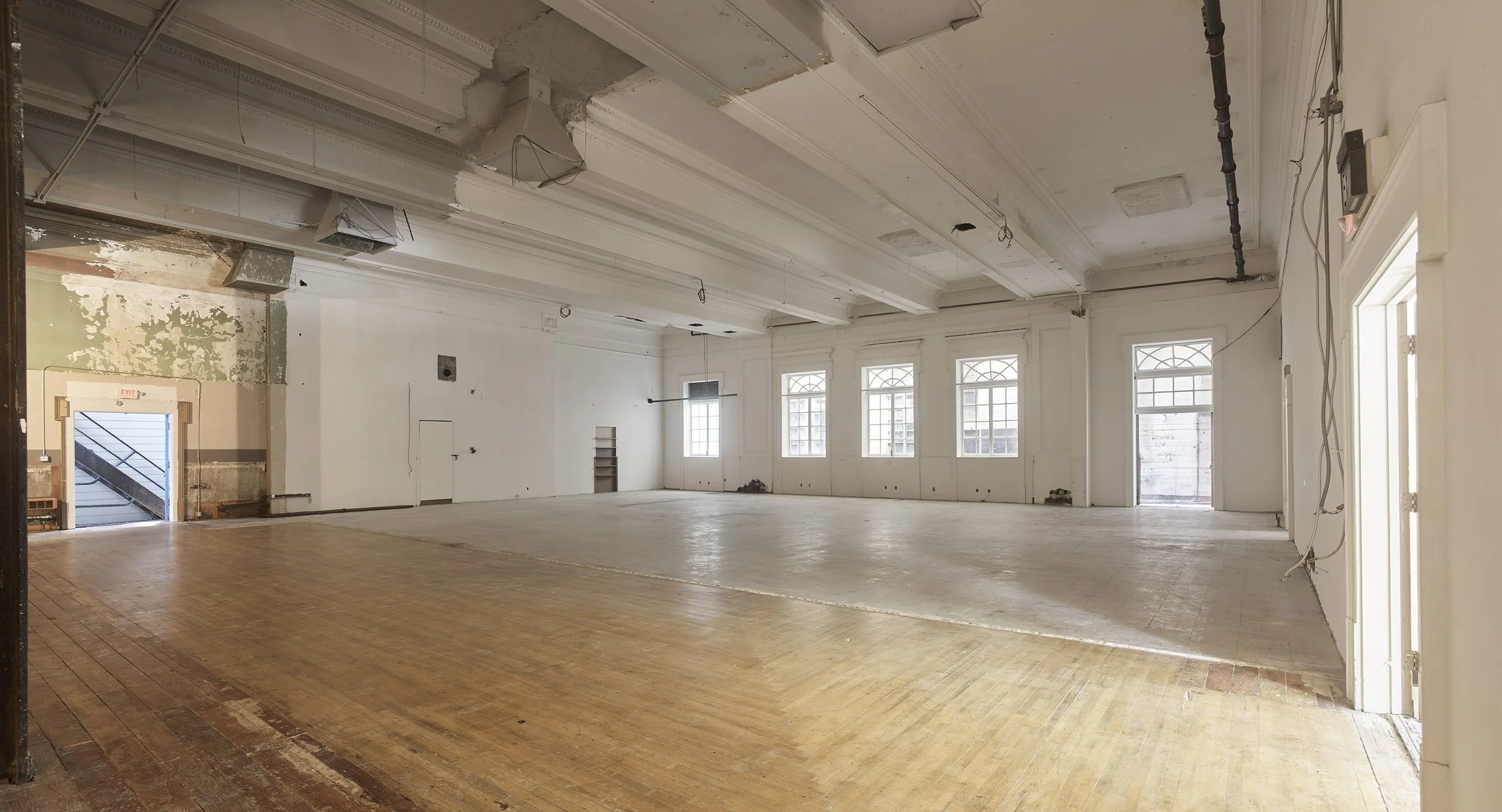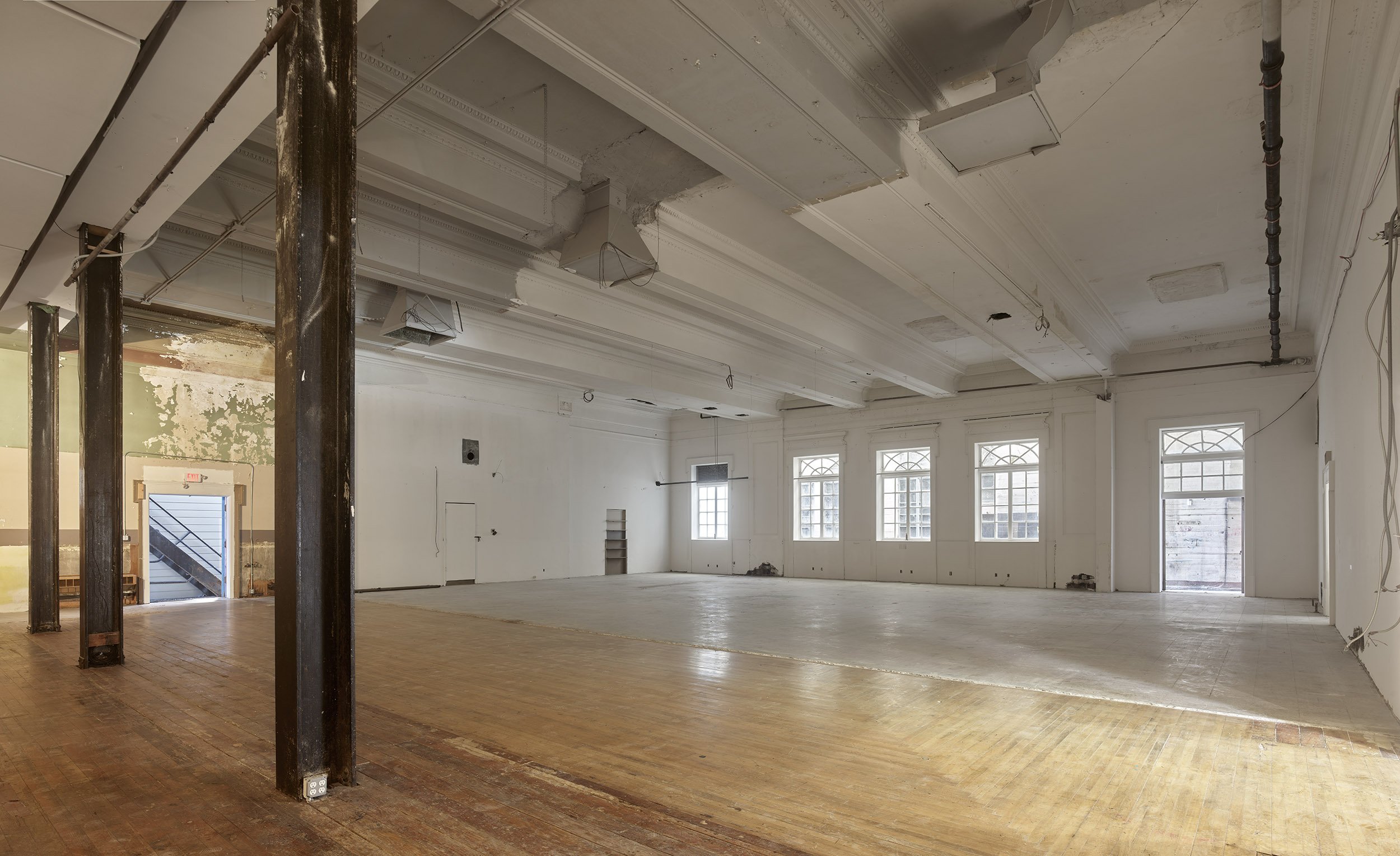 Post-renovation images from the angle of the front space with a fully cleaned-up front area, and hardwood floors refinished to the back of the performance space. The Lab is now approximately 6,700 sq. ft. in total.