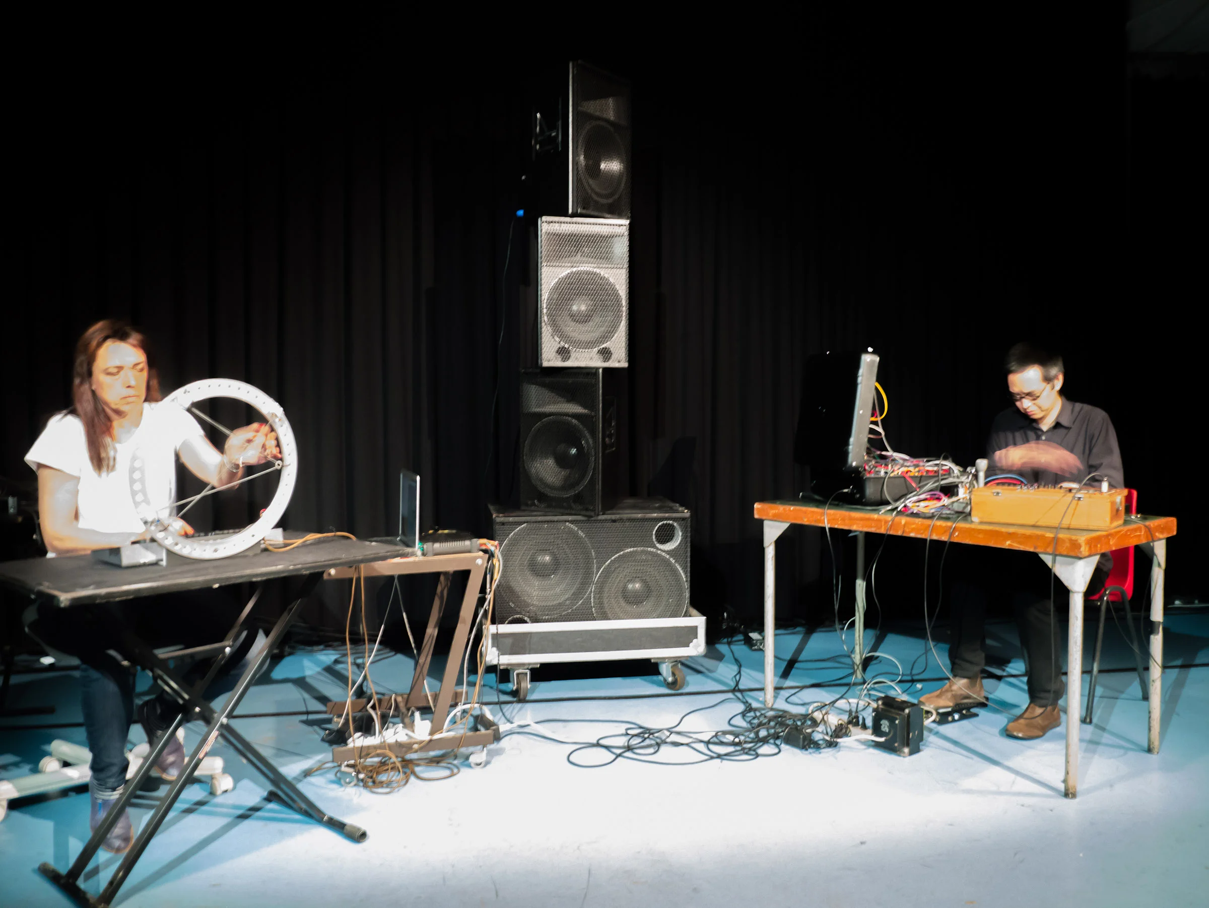 James Fei and Laetitia Sonami started their improvisational collaboration in 2013. While the materials and techniques used by the two musicians differ significantly, both employ tactile interface coupled with electronic systems that exhibit complex behavioral response. Sonami performs with her most recent instrument, the Spring Spyre. Constructed around a web of springs whose signals are analyzed through neural networks which in turn control the audio synthesis in real time, the Spring Spyre can exhibit a wide range of sonic behaviors depending on its training terrains. Fei's setup consists of a mix of old modular equipment and homebrewed circuits. The system is driven by multiple feedback loops, often on the brink of instability. Signals are recursively routed through microphones, spring reverb, and converted between audio and control voltages. Circuit elements are also modified by touch, integrating the non-linearities and the immediacy of the body with the electronic processes.